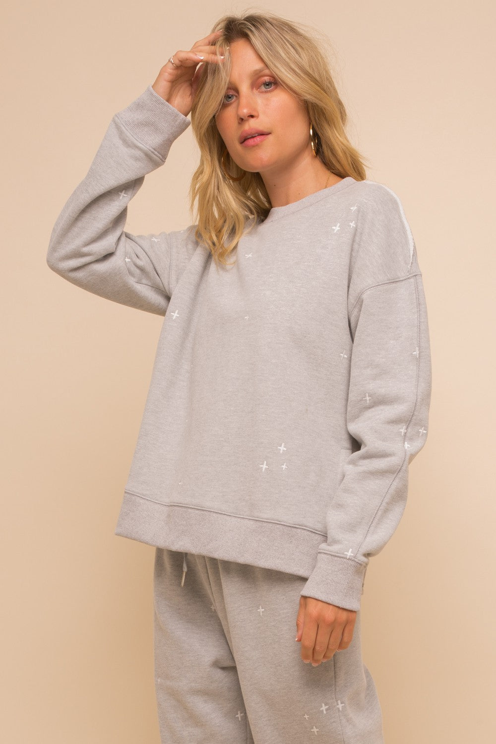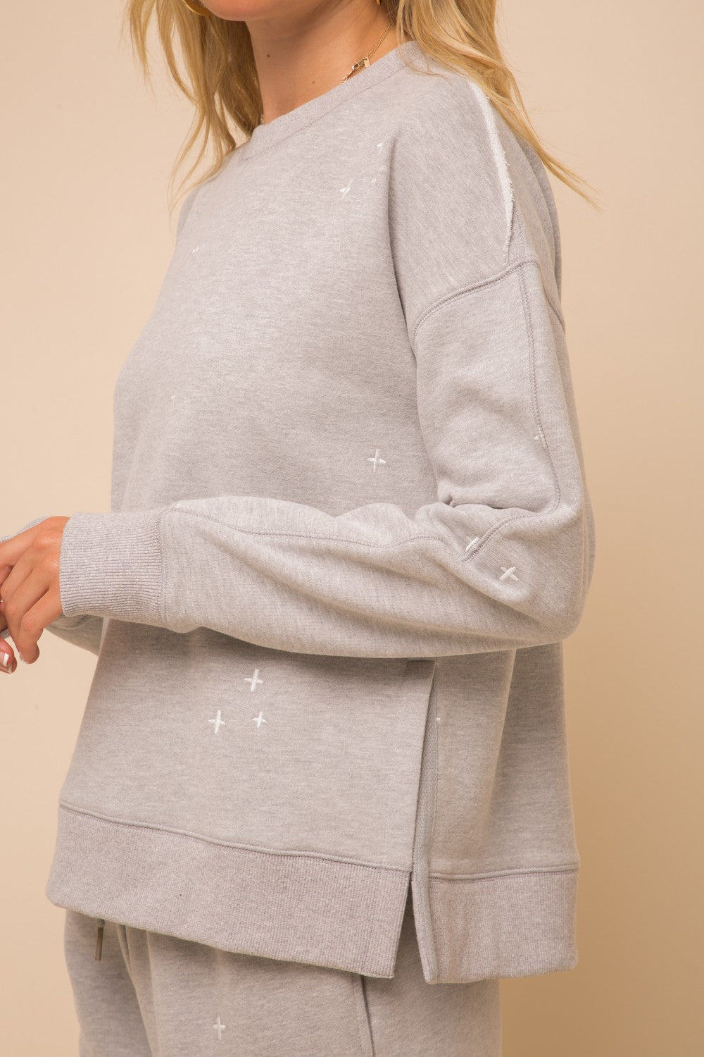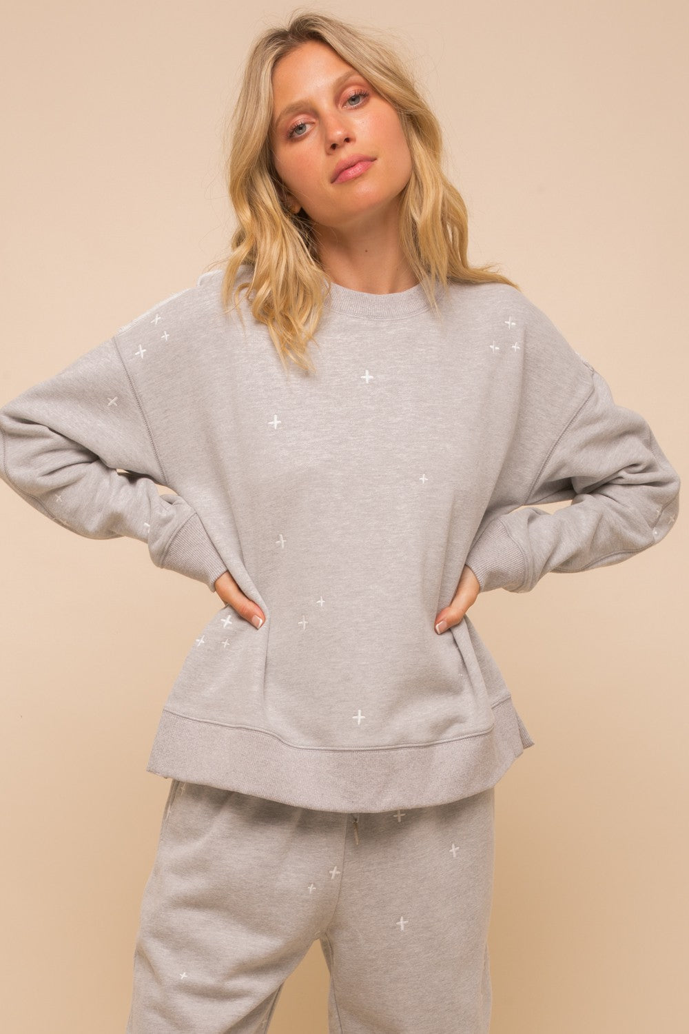 Our Aurora Sweatshirt features side slits on both sides, drop shoulder, crew neckline, and embroidered white “+” start details all over. Designed in a perfect super soft light heathered grey material. Check out our matching Aurora Sweatpants!