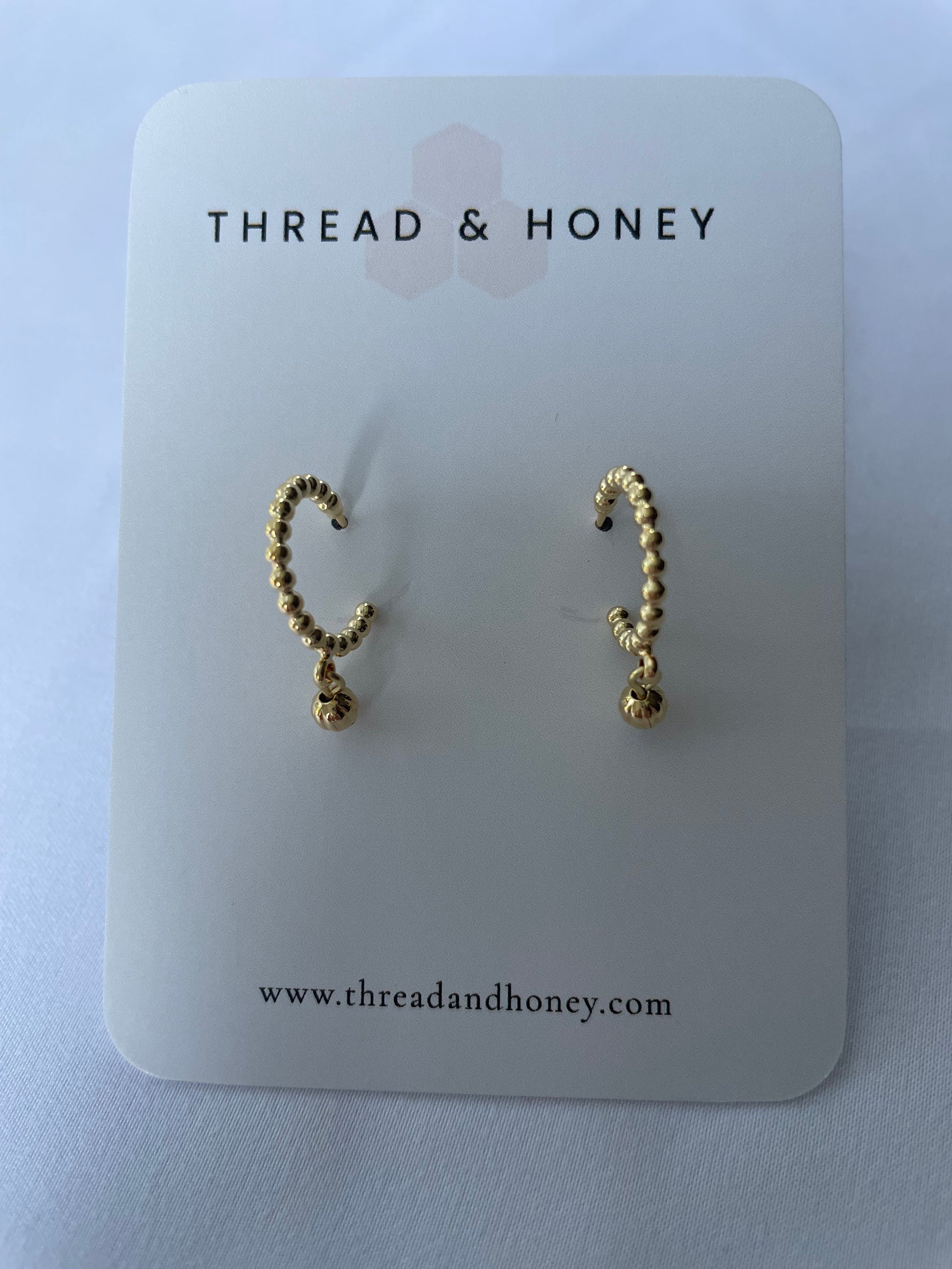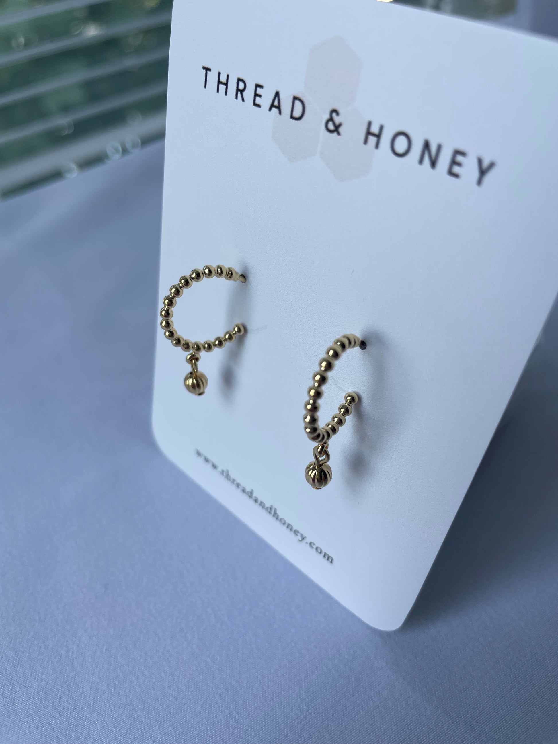 Our Gold Dangle Beaded Hoop Earrings feature a delicate gold bead on 14K gold filled 13mm beaded hoops.