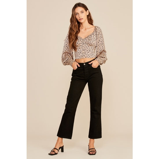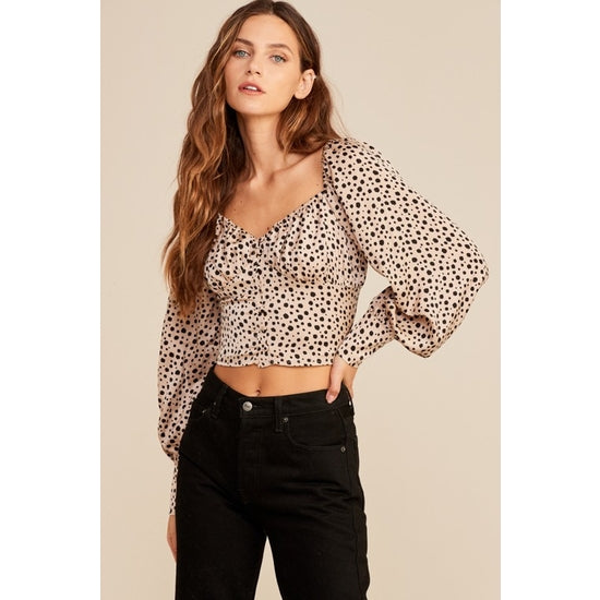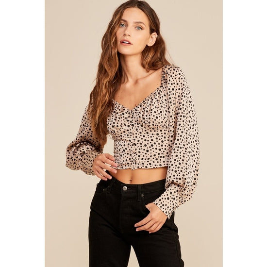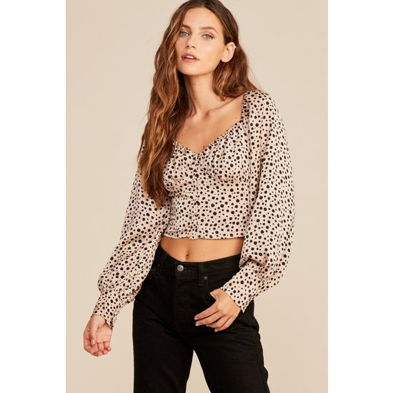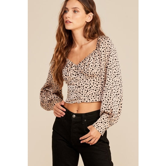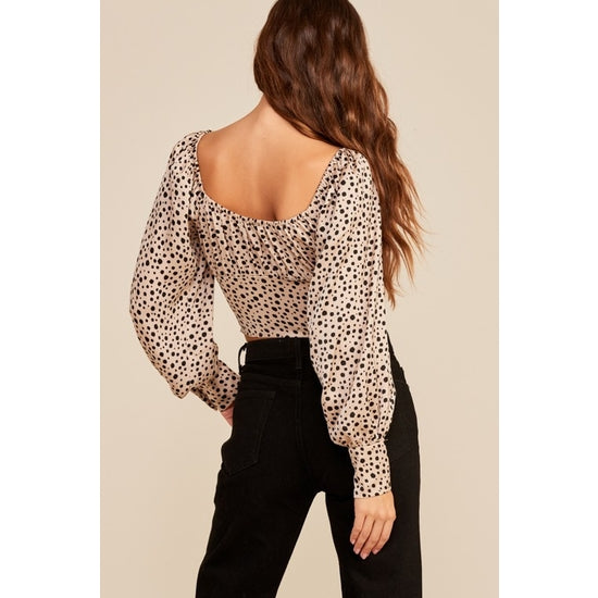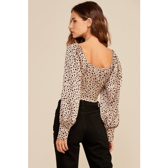 Our On the Dot Top features a beautiful abstract dot print, long sleeves, cropped length, button details down center body and sleeves, sweetheart neckline, and elastic neckline to hold the top in place! Designed in a lovely cream/champagne color and satin-like material.