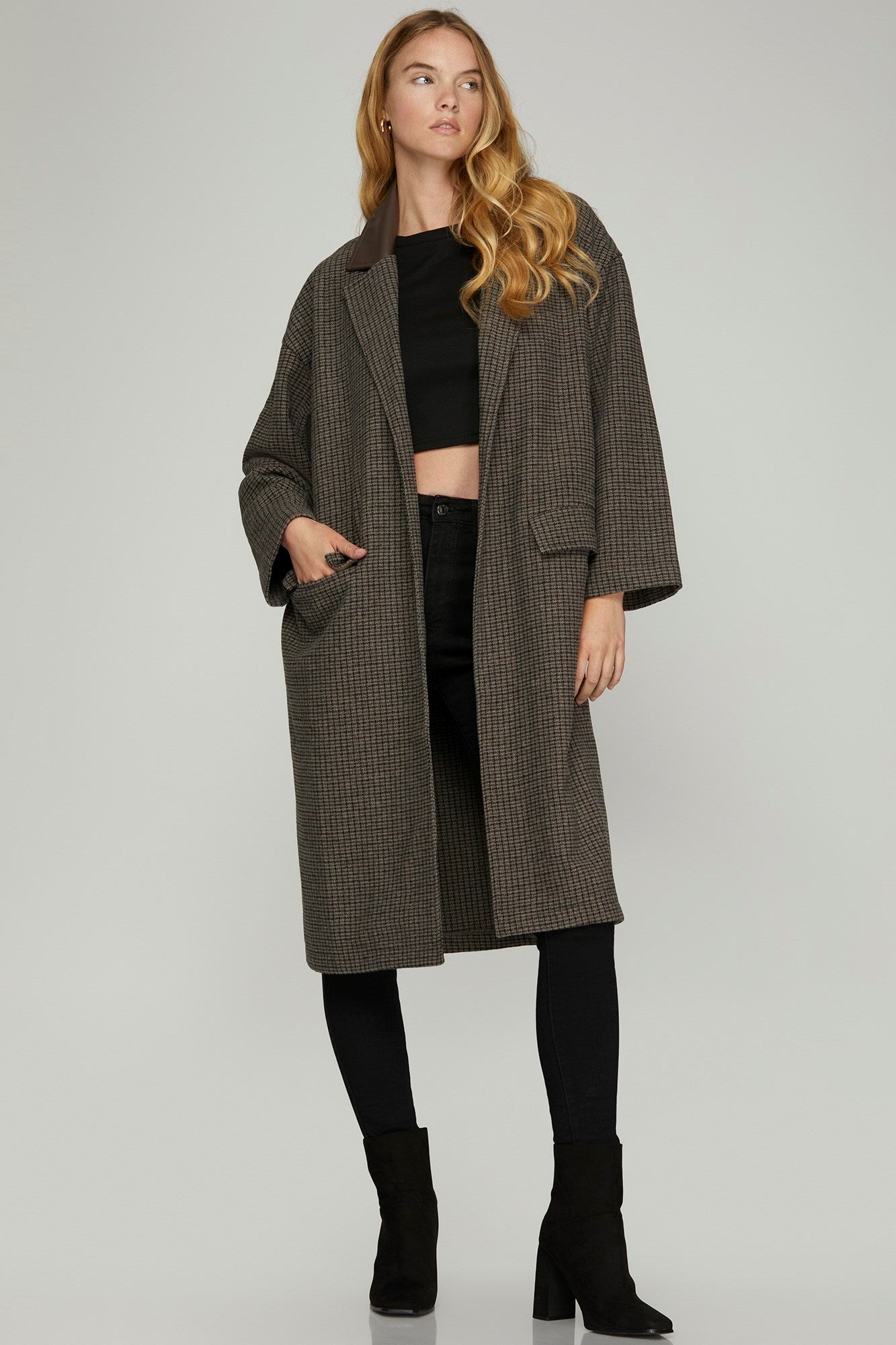 Looking for the perfect layering piece to keep you warm? Look no further. Our Oversized Check Open Front Coat is right on trend and perfect to layer over just about any outfit whether you're going out or rocking athleisure. It's sure to add the perfect finishing touch. Featuring a neutral grey/brown check pattern, leather-like contrast collar, and front pockets.