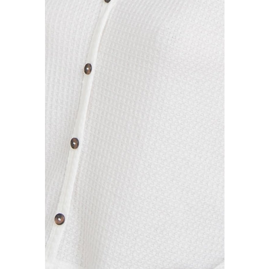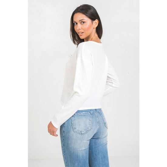 Our Sara Top features a V-neck neckline, button down details, ivory color waffle knit material, and long sleeves. Super lightweight and versatile!