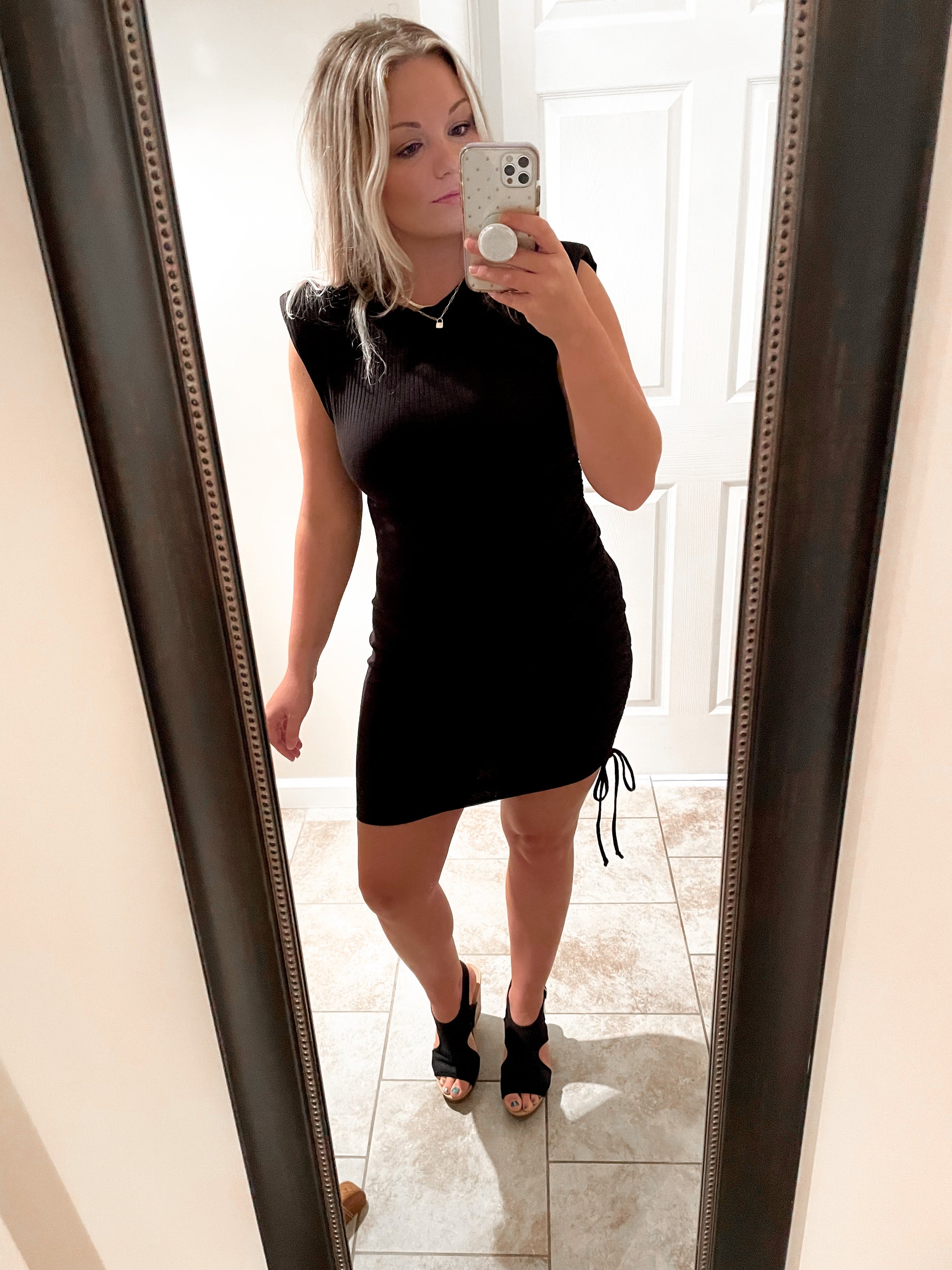 Our Selena Dress features a side cinch tie, ribbed knit material, and cap sleeves with light shoulder padding! A beautiful elevated basic black dress.